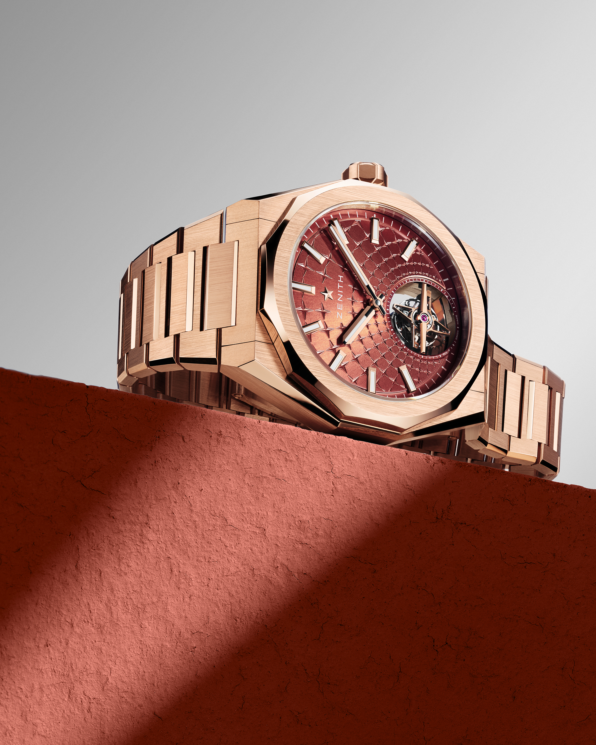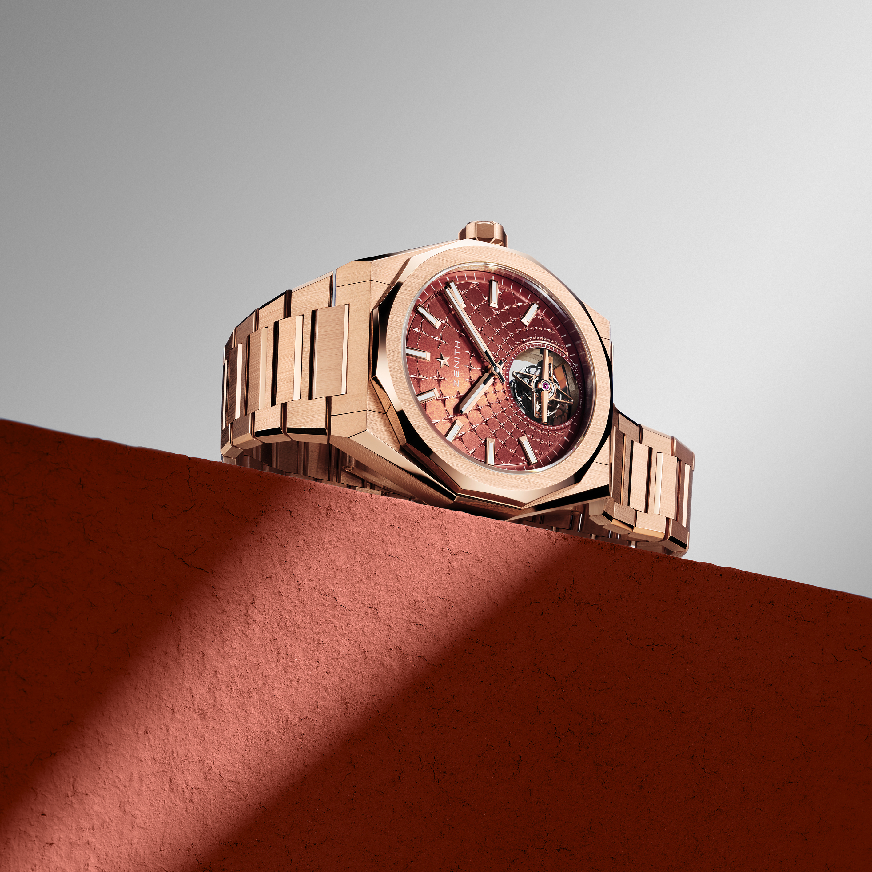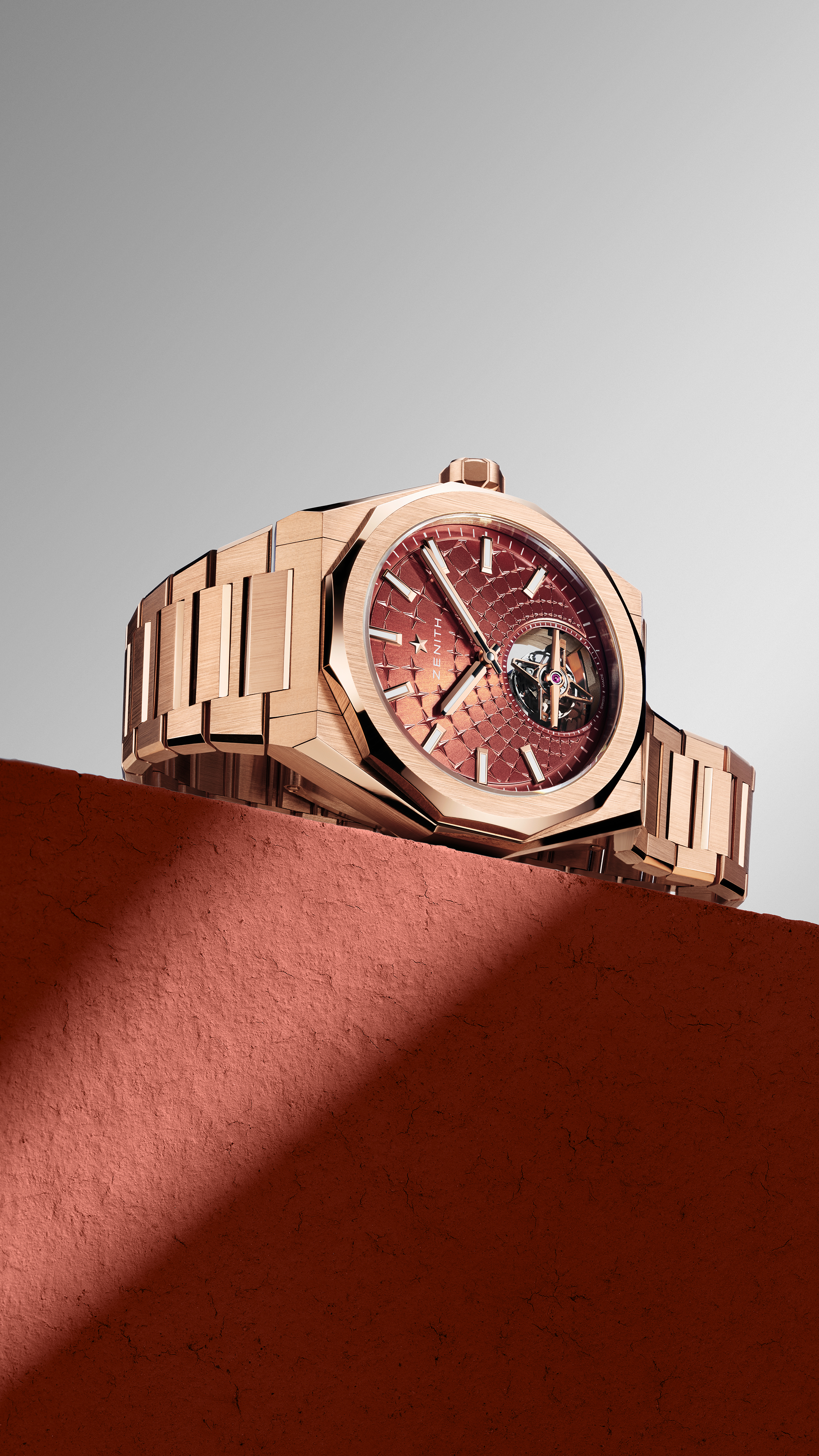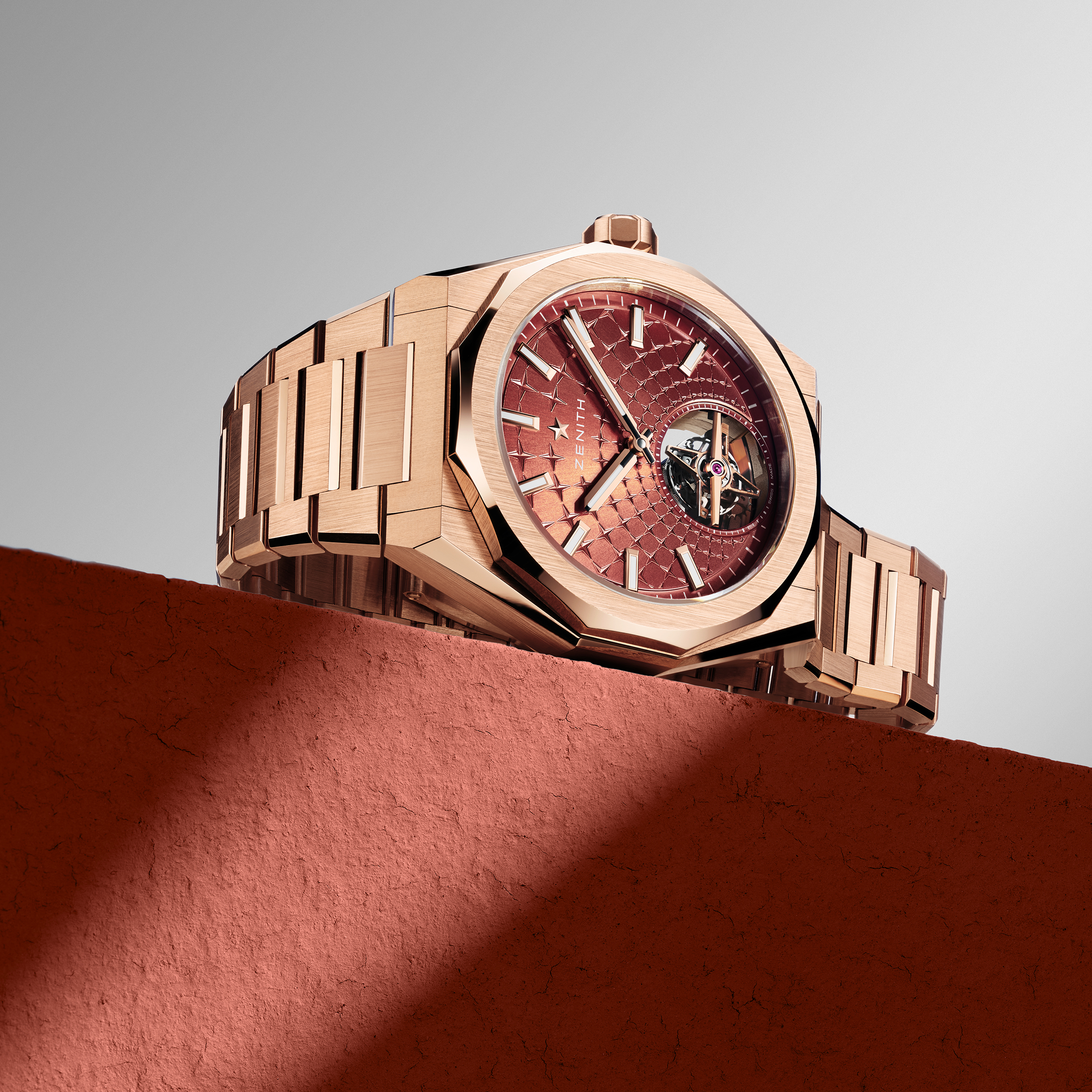 Now, with the tourbillon version, the DEFY Skyline appears in full rose gold, rediscovering its sharp facets through the warm glow of the precious metal. Alternating satin-brushed and polished surfaces accentuate the 41mm case’s geometry, revealing a striking new perspective on its architectural design. As with previous DEFY Skyline Tourbillon editions, the dial is adorned with a mesmerizing pattern of engraved four-pointed stars that radiate outward from the tourbillon aperture at 6 o’clock. For this rose gold interpretation, ZENITH introduces a deep brick-red dial, a chromatic nod to the Manufacture’s historic building in Le Locle, with its distinctive red-and-white brickwork. Rose-gold hands, enhanced with Super-LumiNova, ensure legibility while harmonizing with the case’s luxurious tones, while the oscillating weight also bears the warm glow of gold, further underscoring the watch’s refined character.
