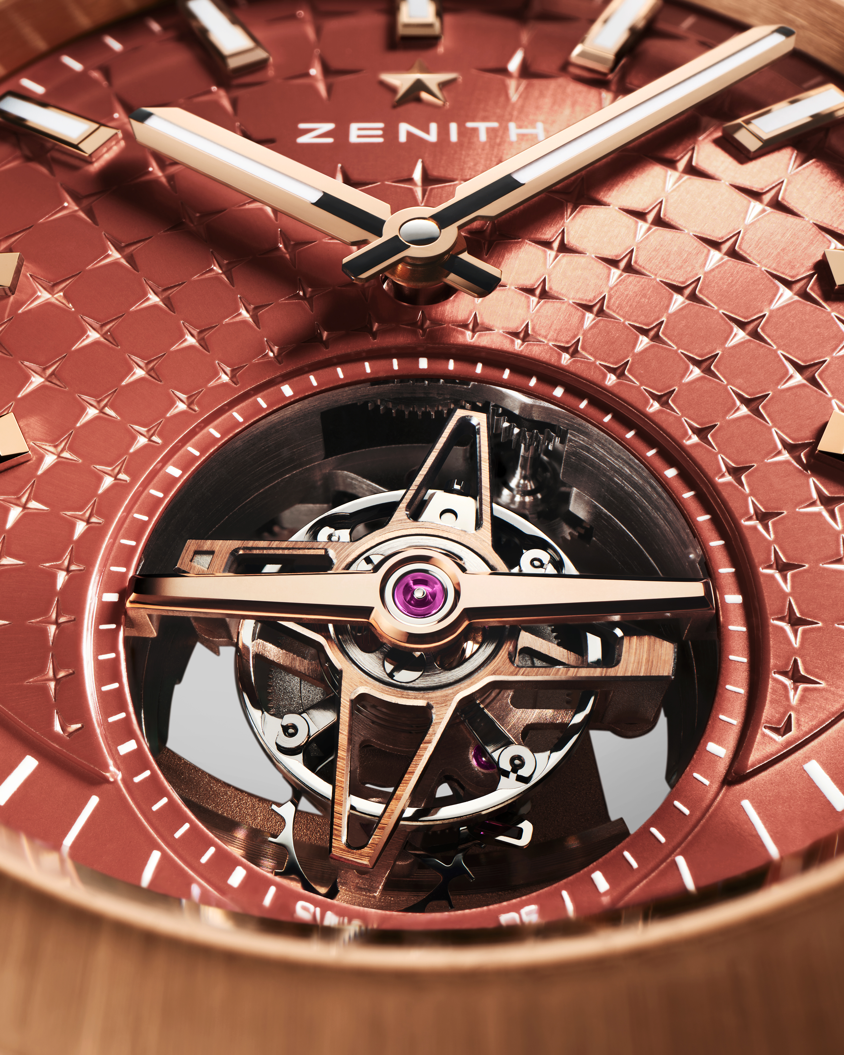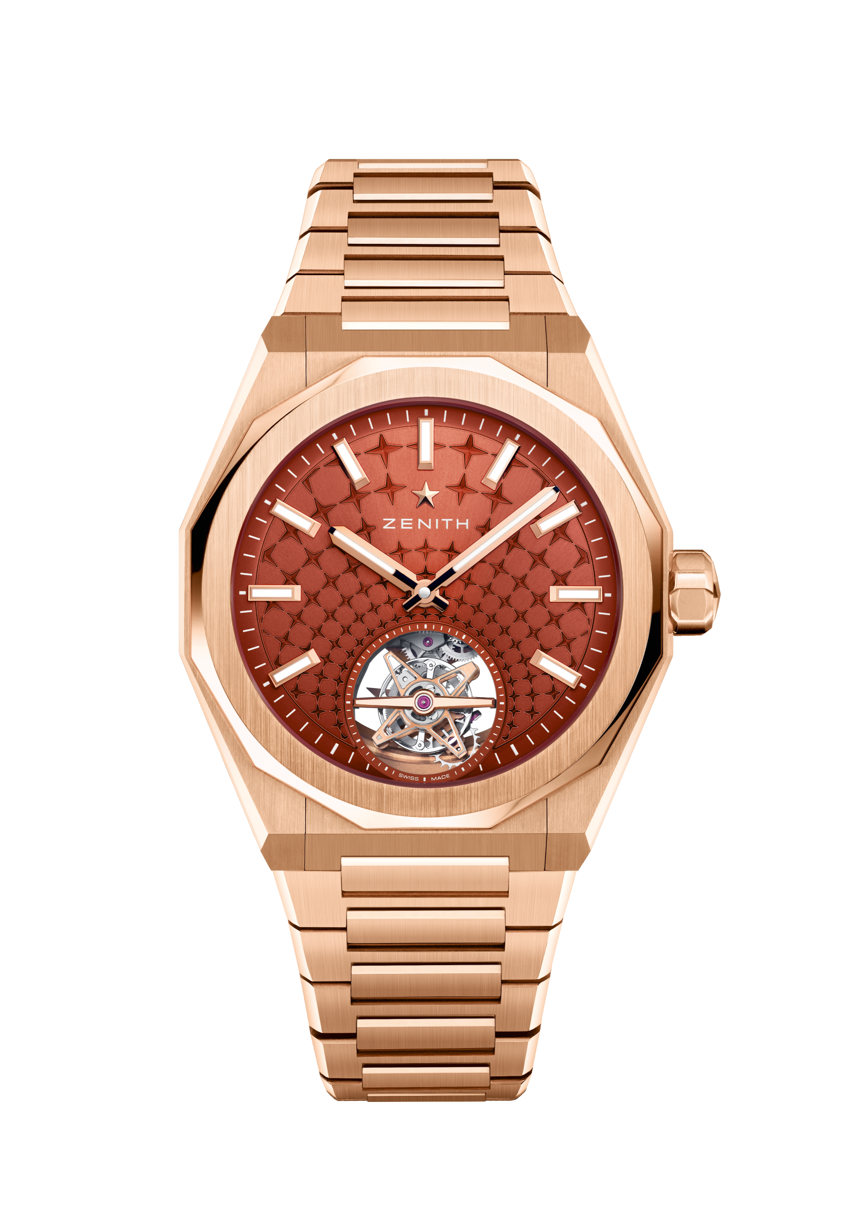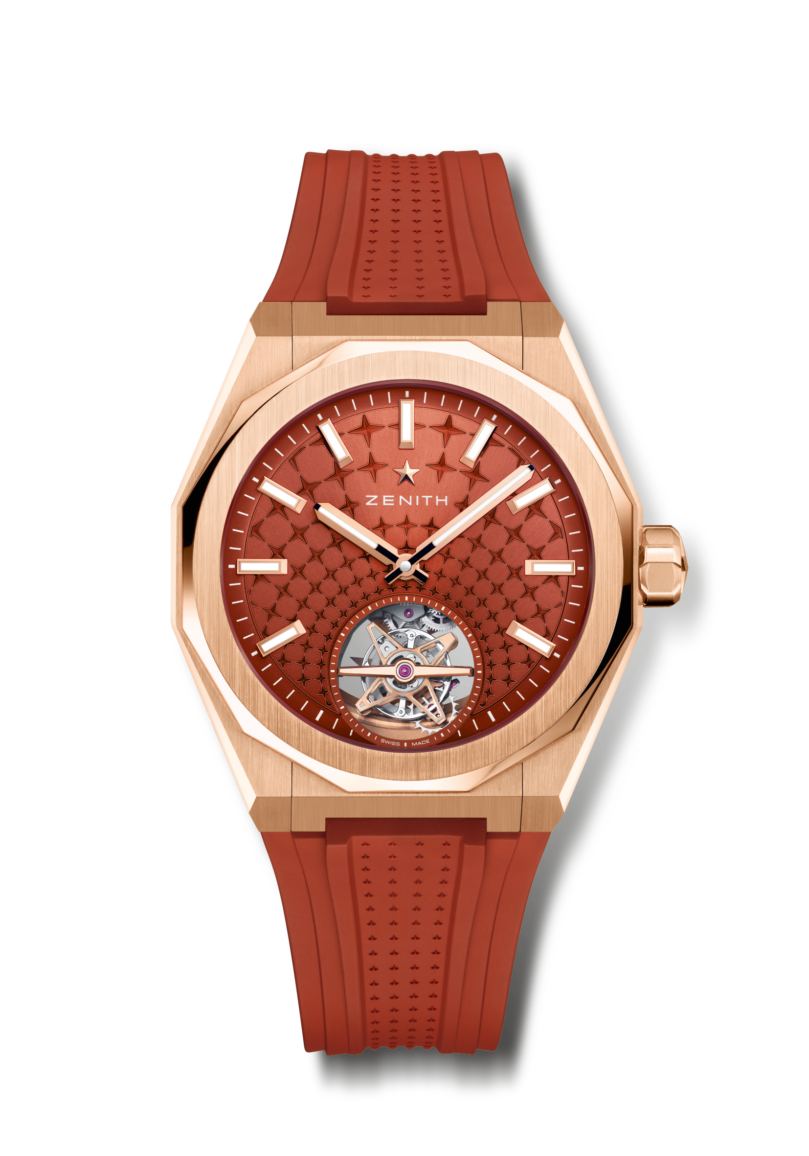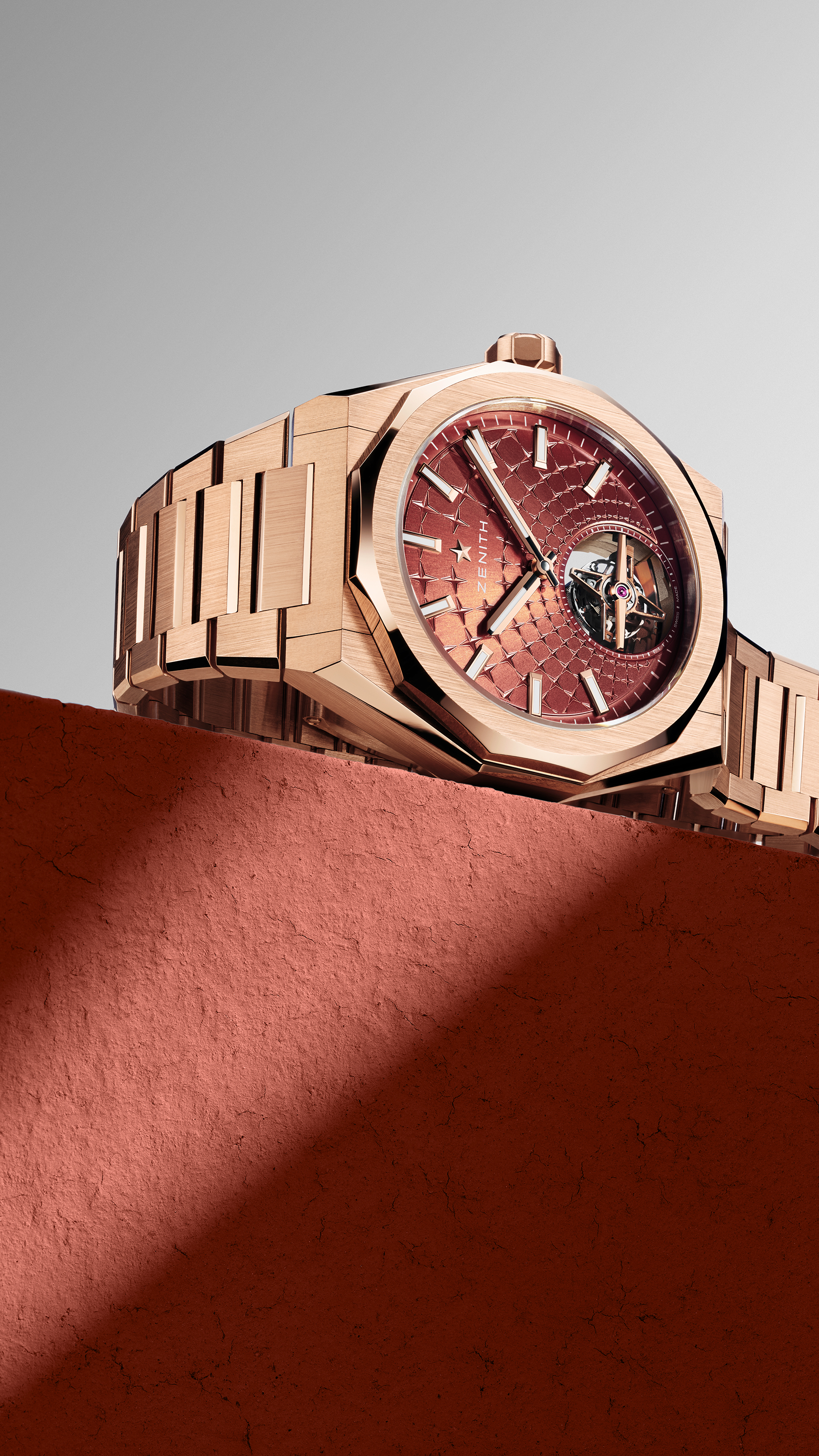 Now, with the tourbillon version, the DEFY Skyline appears in full rose gold, rediscovering its sharp facets through the warm glow of the precious metal. Alternating satin-brushed and polished surfaces accentuate the 41mm case’s geometry, revealing a striking new perspective on its architectural design. As with previous DEFY Skyline Tourbillon editions, the dial is adorned with a mesmerizing pattern of engraved four-pointed stars that radiate outward from the tourbillon aperture at 6 o’clock. For this rose gold interpretation, ZENITH introduces a deep brick-red dial, a chromatic nod to the Manufacture’s historic building in Le Locle, with its distinctive red-and-white brickwork. Rose-gold hands, enhanced with Super-LumiNova, ensure legibility while harmonizing with the case’s luxurious tones, while the oscillating weight also bears the warm glow of gold, further underscoring the watch’s refined character.