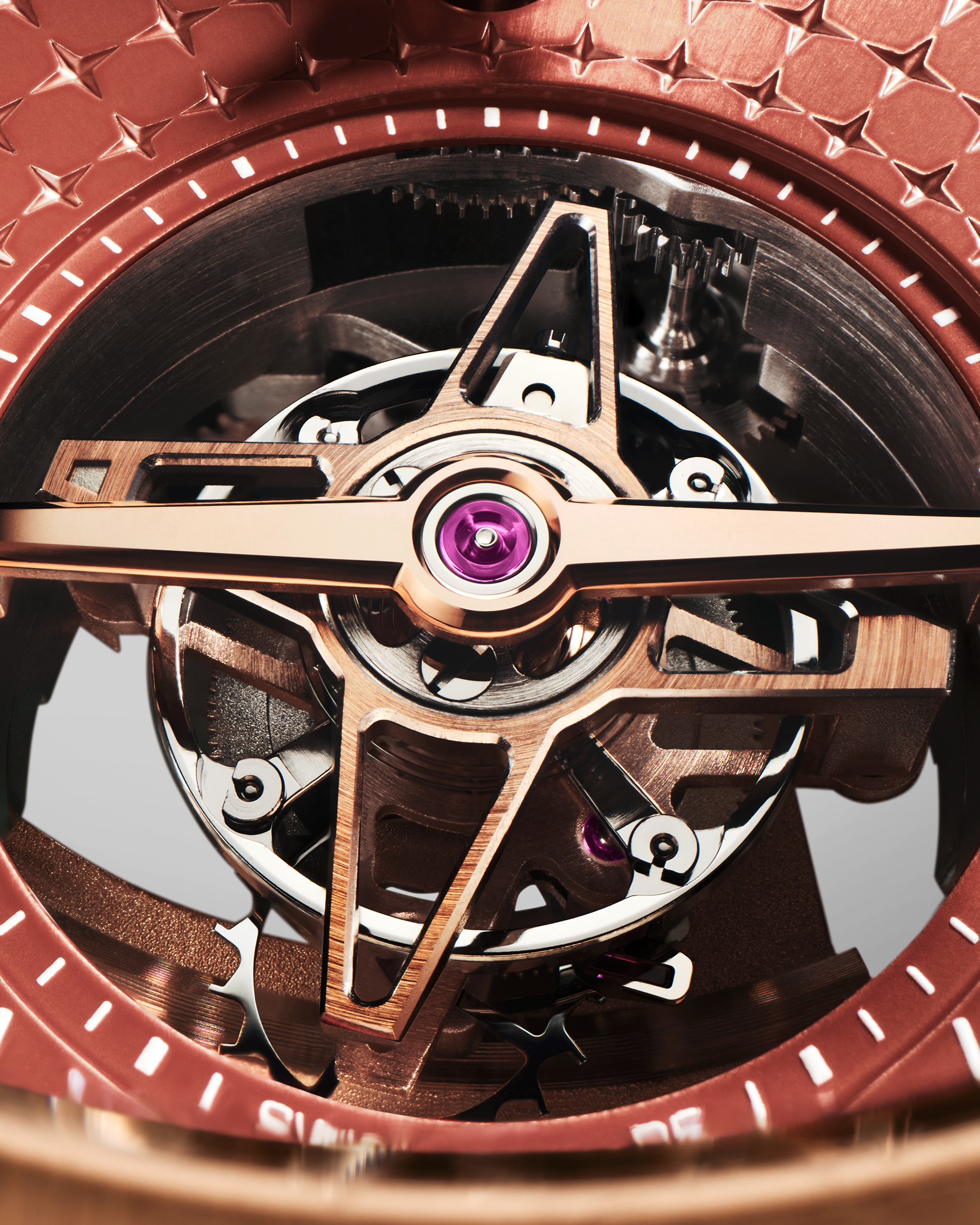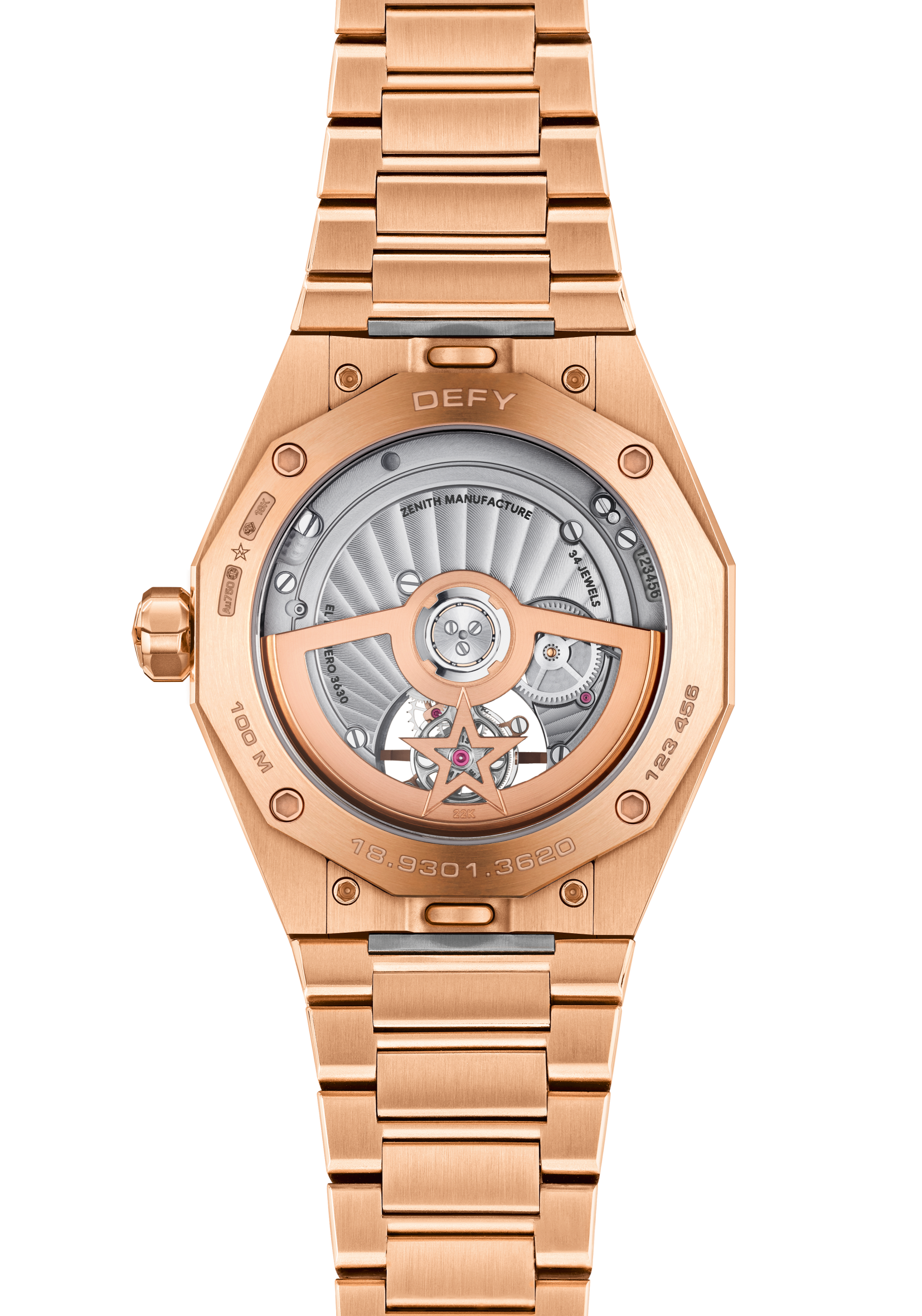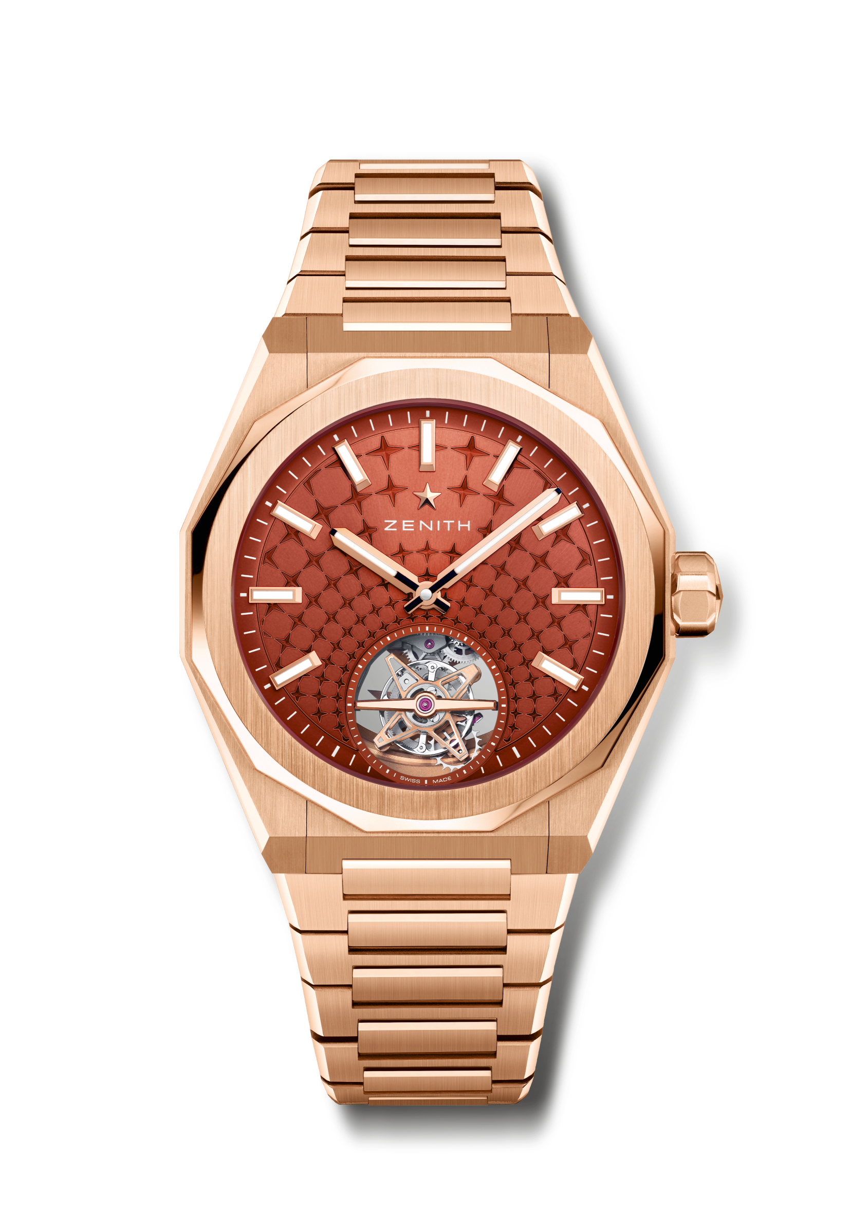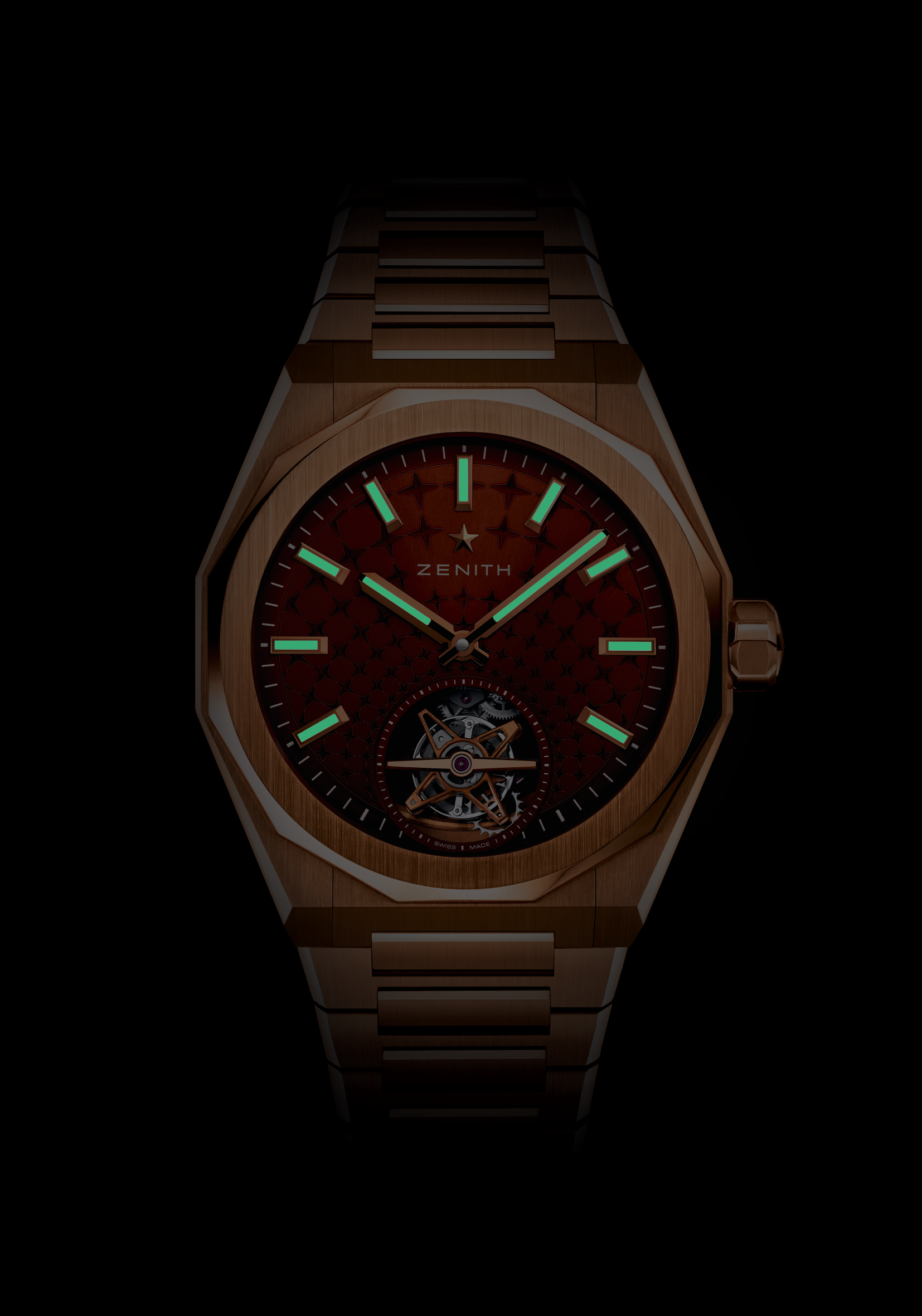 Now, with the tourbillon version, the DEFY Skyline appears in full rose gold, rediscovering its sharp facets through the warm glow of the precious metal. Alternating satin-brushed and polished surfaces accentuate the 41mm case’s geometry, revealing a striking new perspective on its architectural design. As with previous DEFY Skyline Tourbillon editions, the dial is adorned with a mesmerizing pattern of engraved four-pointed stars that radiate outward from the tourbillon aperture at 6 o’clock. For this rose gold interpretation, ZENITH introduces a deep brick-red dial, a chromatic nod to the Manufacture’s historic building in Le Locle, with its distinctive red-and-white brickwork. Rose-gold hands, enhanced with Super-LumiNova, ensure legibility while harmonizing with the case’s luxurious tones, while the oscillating weight also bears the warm glow of gold, further underscoring the watch’s refined character.