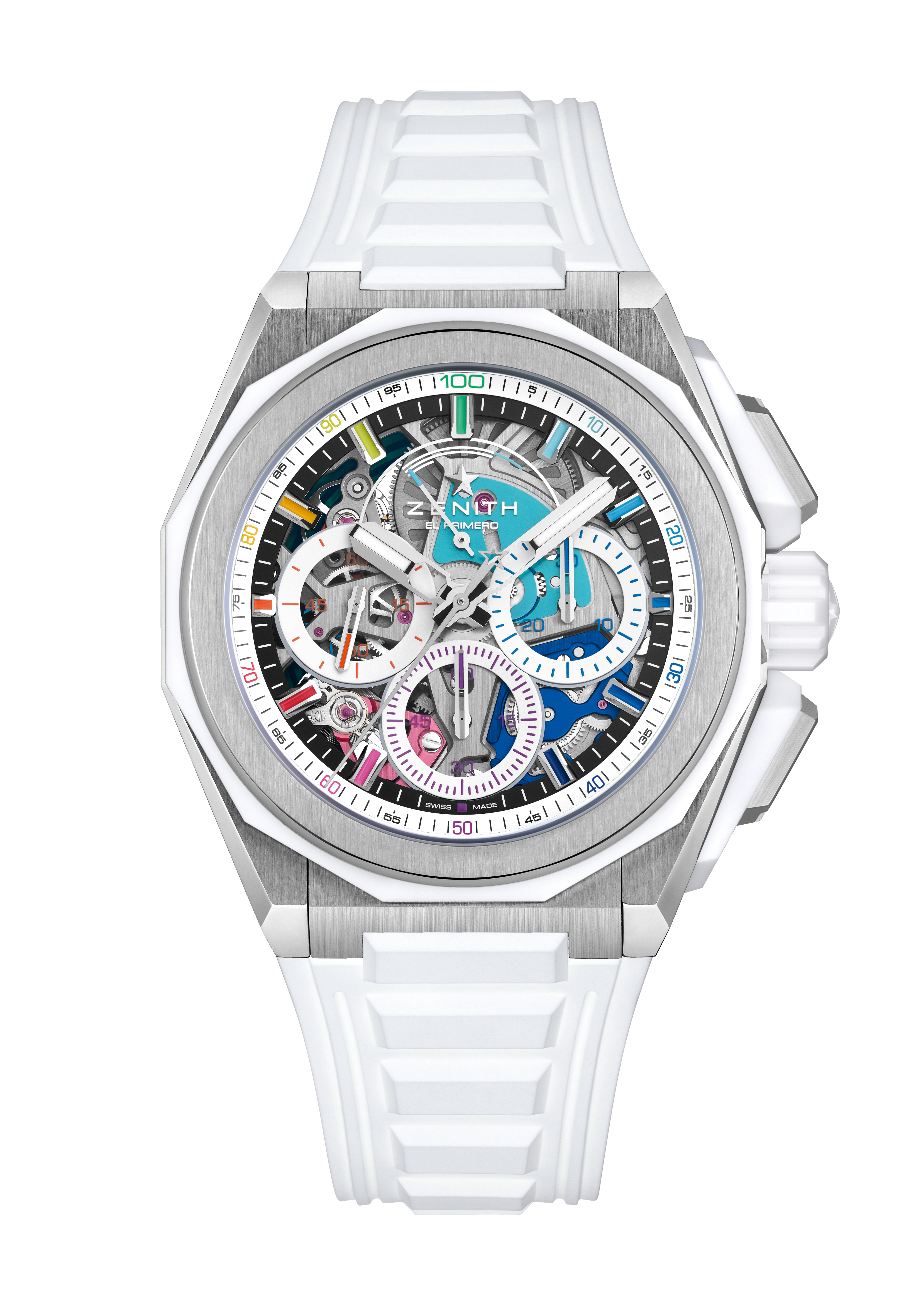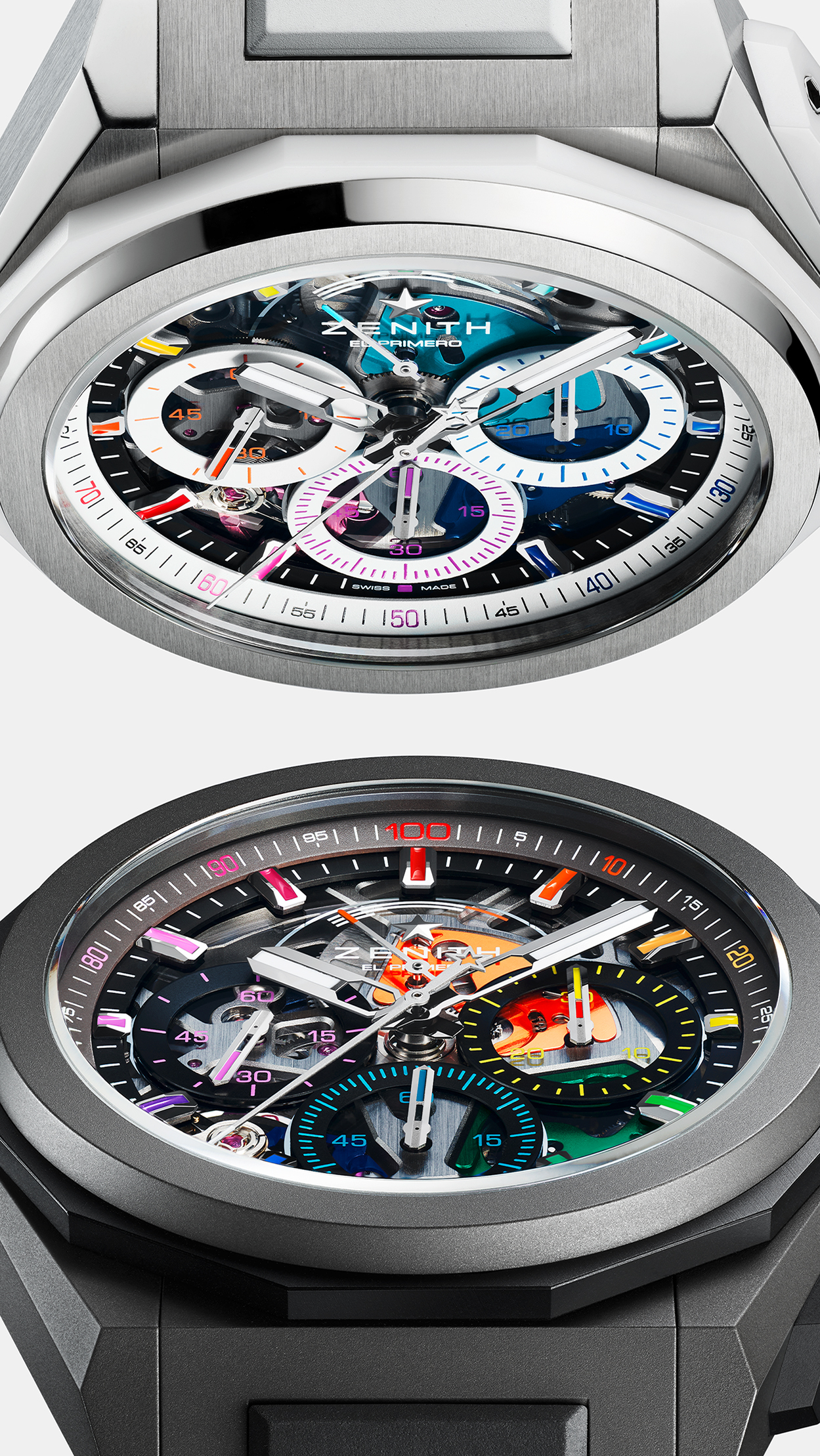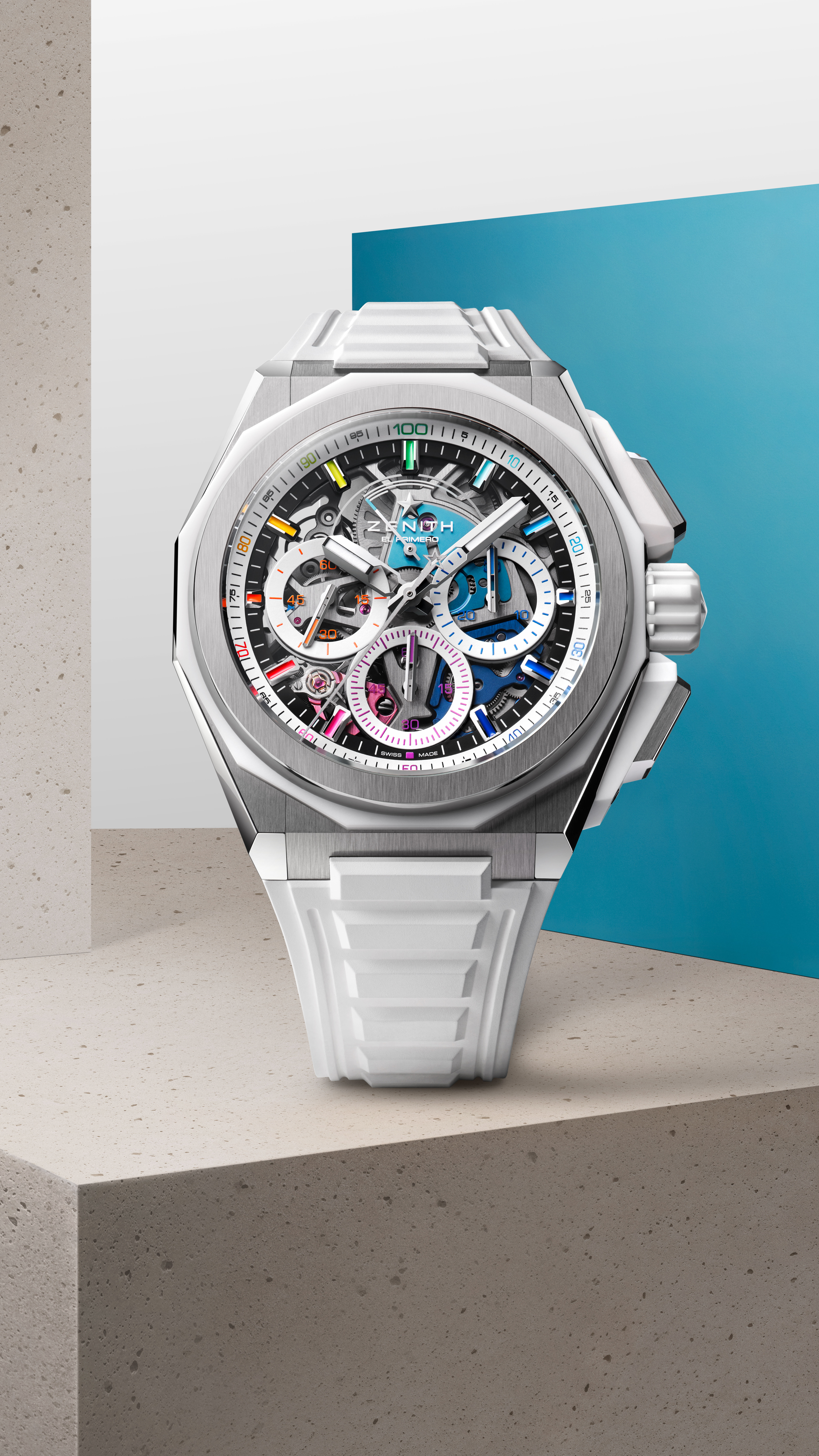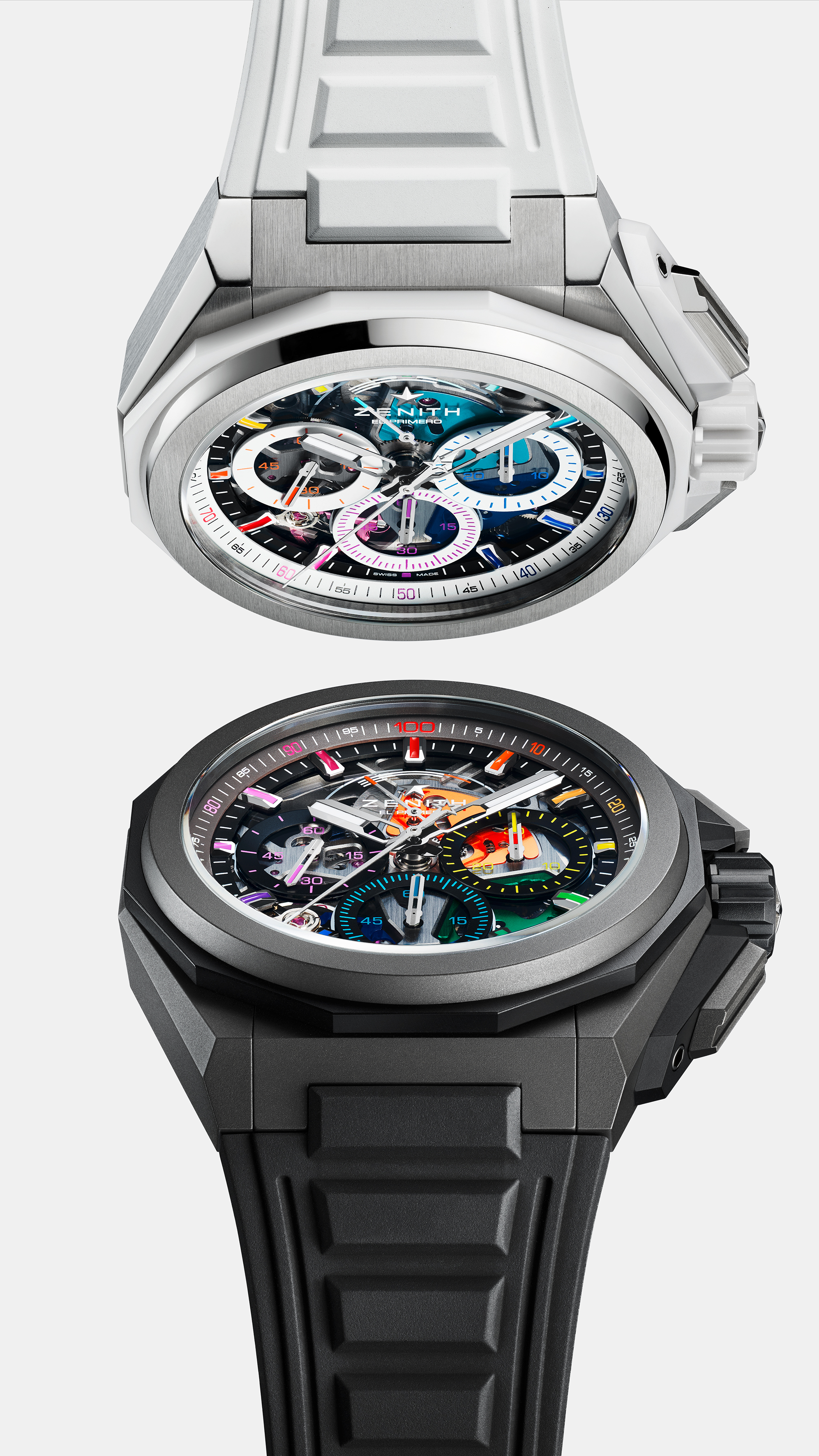 The two ZENITH DEFY Extreme Chroma editions combine titanium and ceramic, accentuated by a distinctive spectrum of colours. Their angular 45mm case comes either in microblasted titanium or in brushed and polished titanium, while the dodecagonal bezel, pusher protectors and crown are crafted in black micro-blasted titanium or white ceramic. The interplay of materials and finishes accentuates the DEFY Extreme’s architectural geometry, reinforcing its bold and dynamic character. Engineered for performance, it offers water resistance up to 20 ATM, making it ready for the most demanding conditions.
