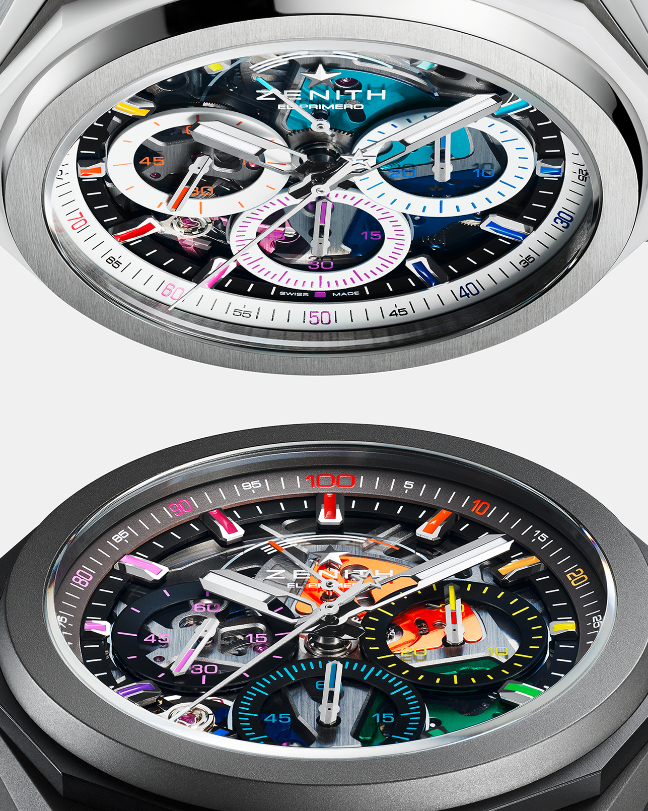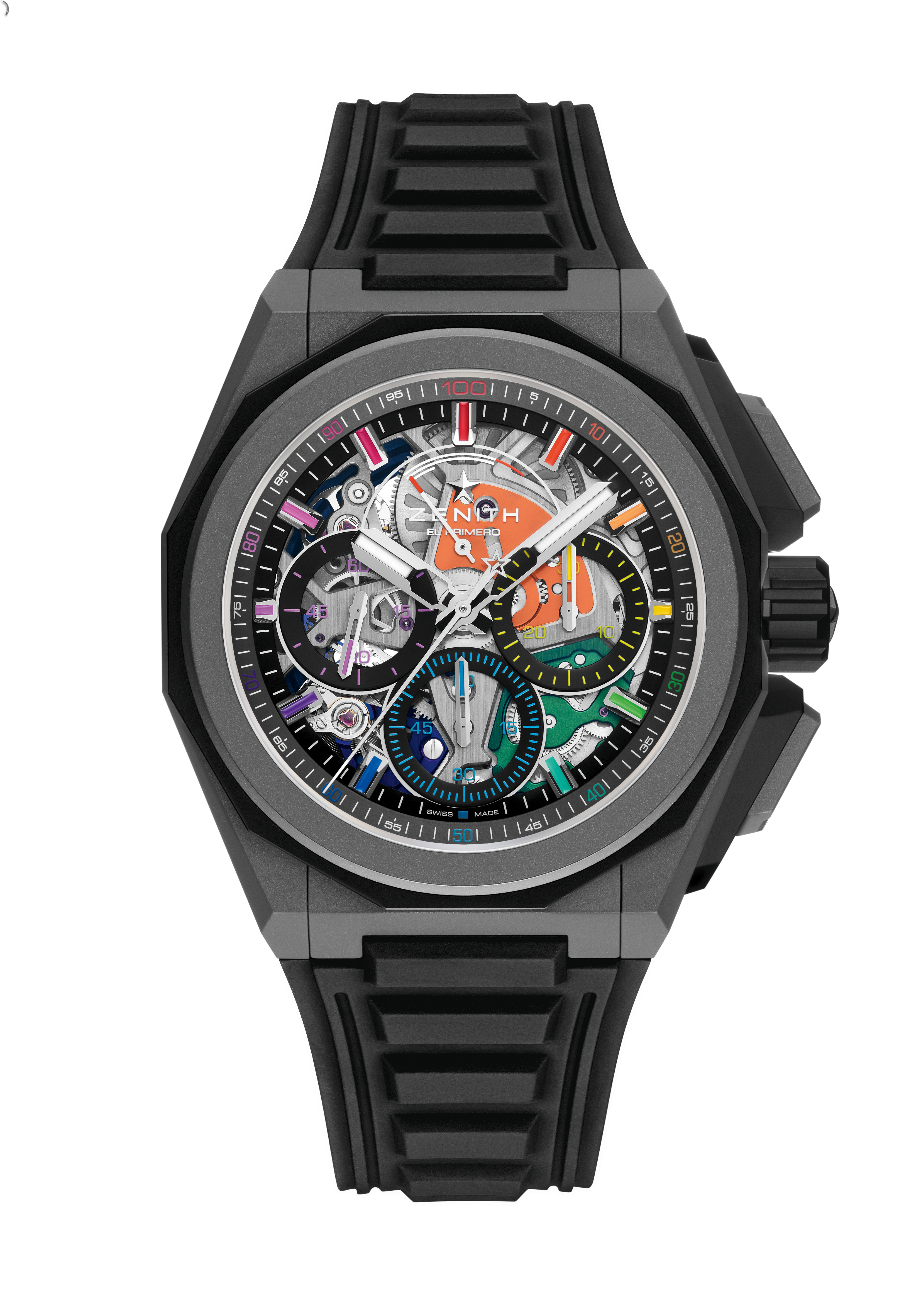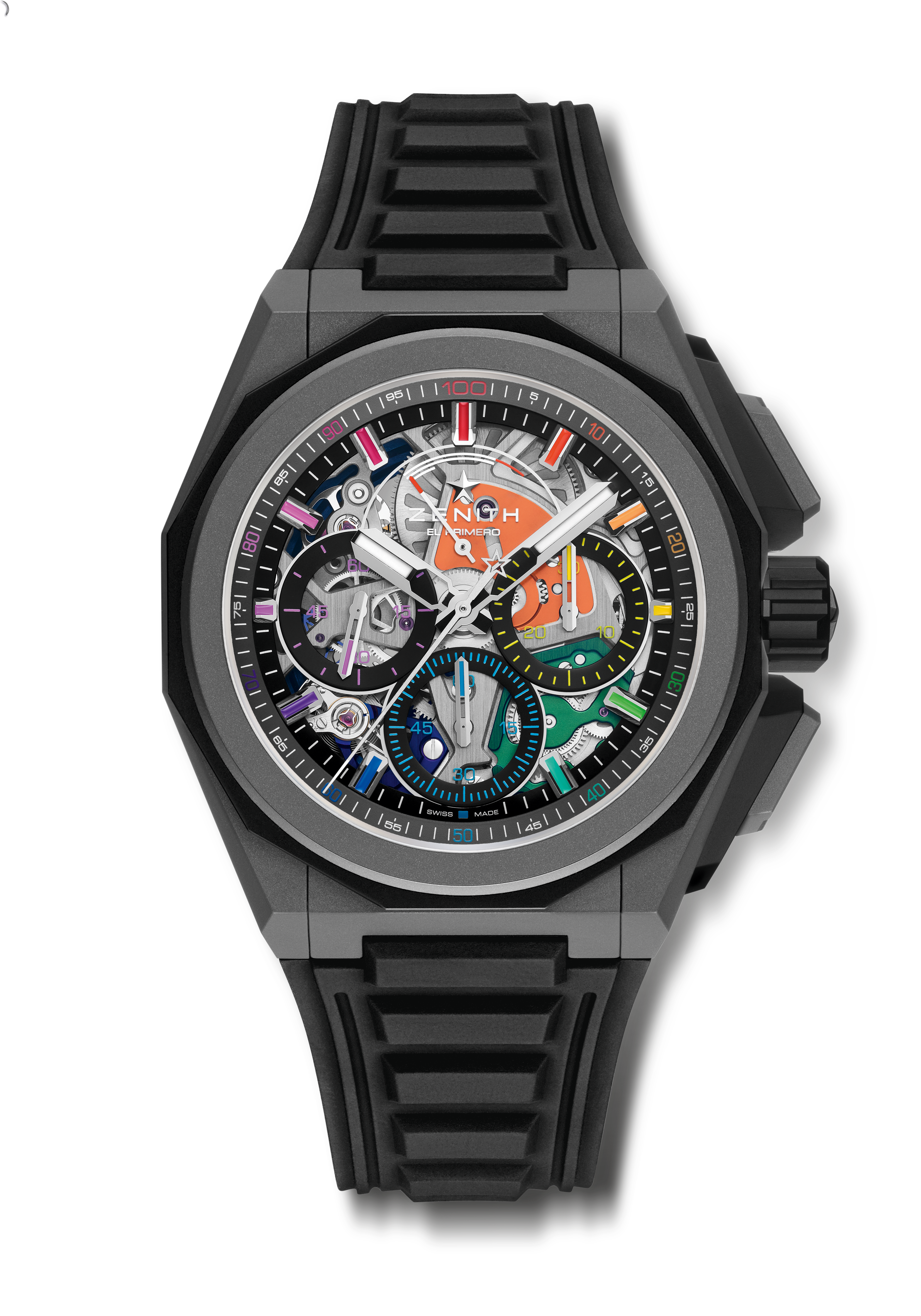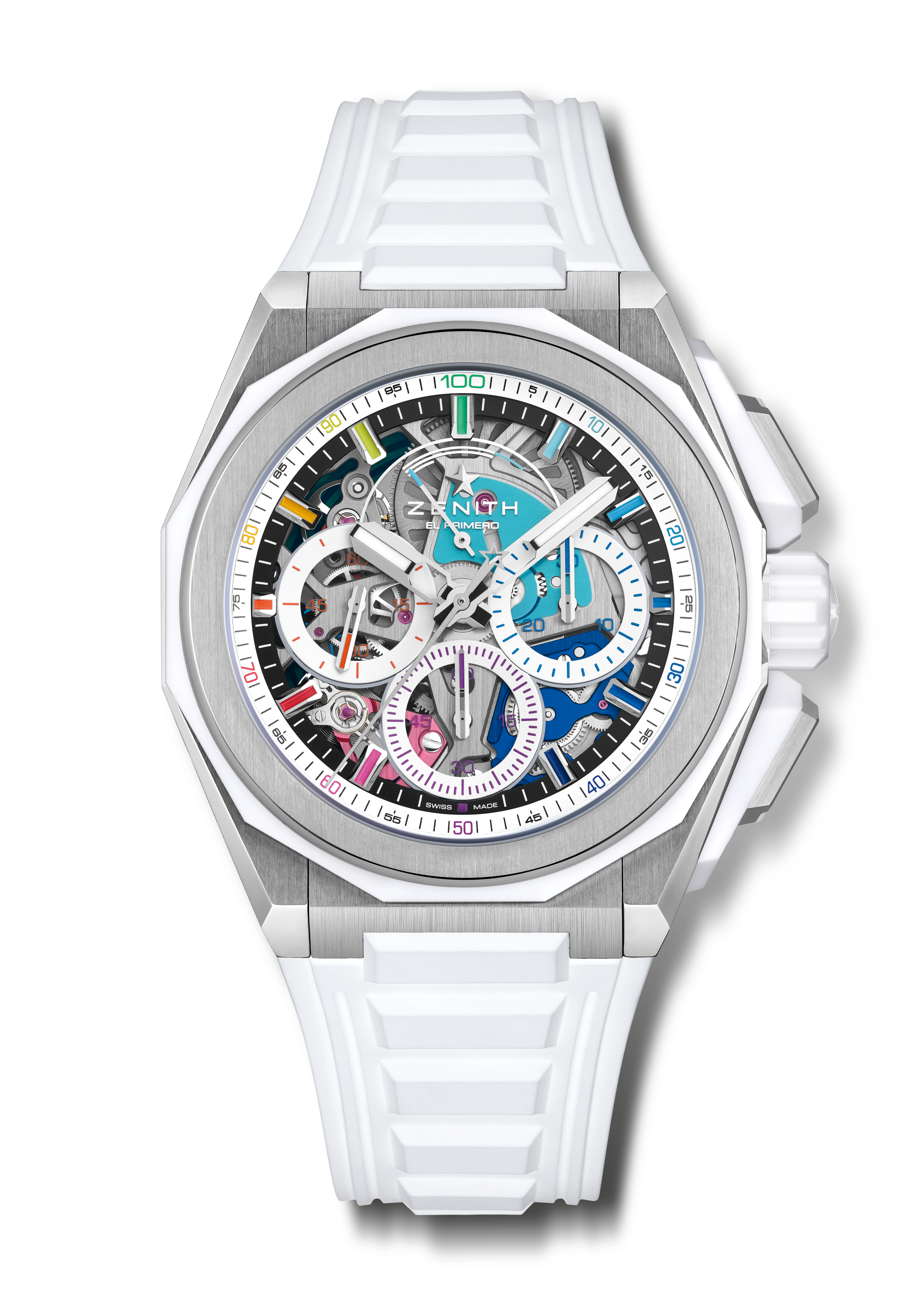 The two ZENITH DEFY Extreme Chroma editions combine titanium and ceramic, accentuated by a distinctive spectrum of colours. Their angular 45mm case comes either in microblasted titanium or in brushed and polished titanium, while the dodecagonal bezel, pusher protectors and crown are crafted in black micro-blasted titanium or white ceramic. The interplay of materials and finishes accentuates the DEFY Extreme’s architectural geometry, reinforcing its bold and dynamic character. Engineered for performance, it offers water resistance up to 20 ATM, making it ready for the most demanding conditions.
