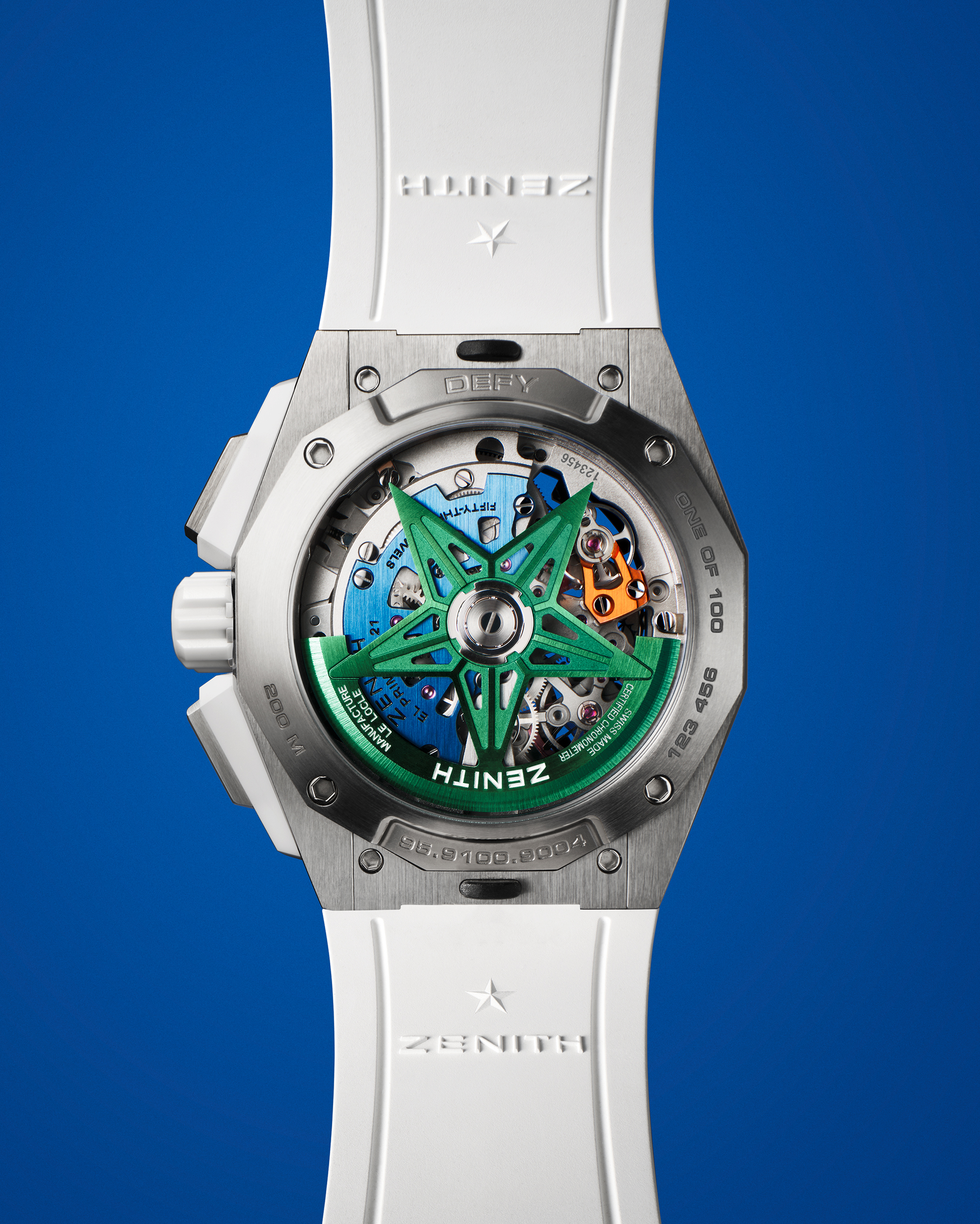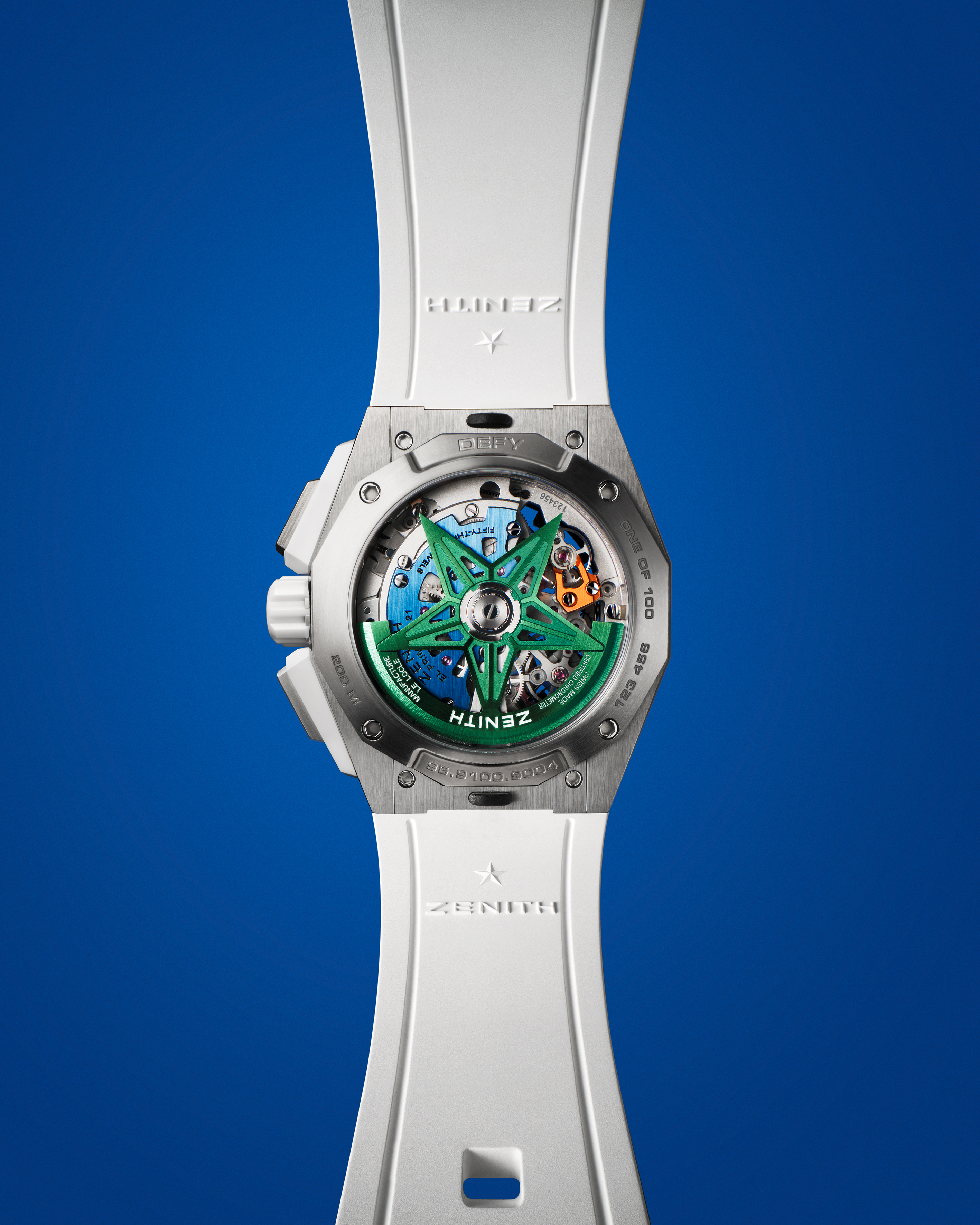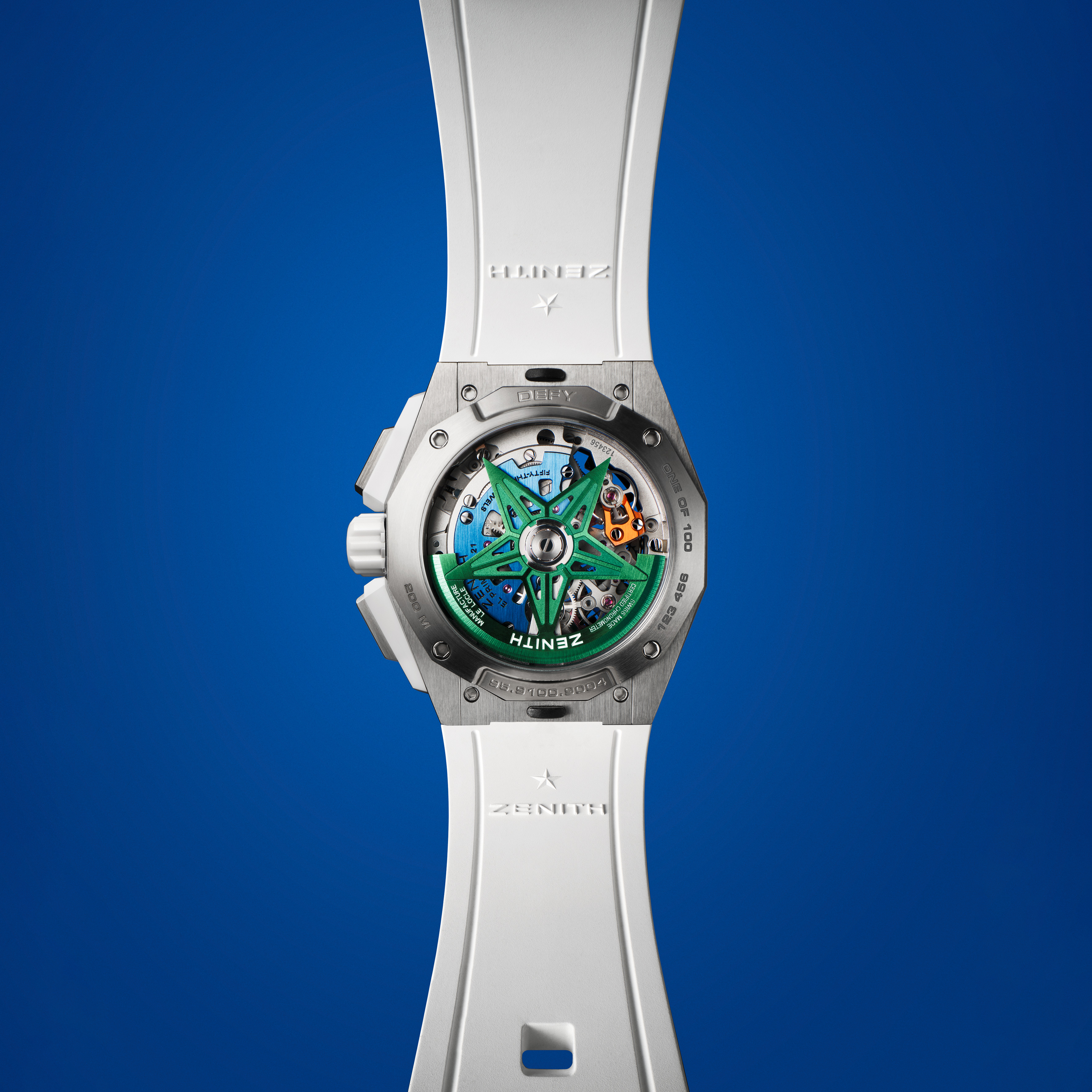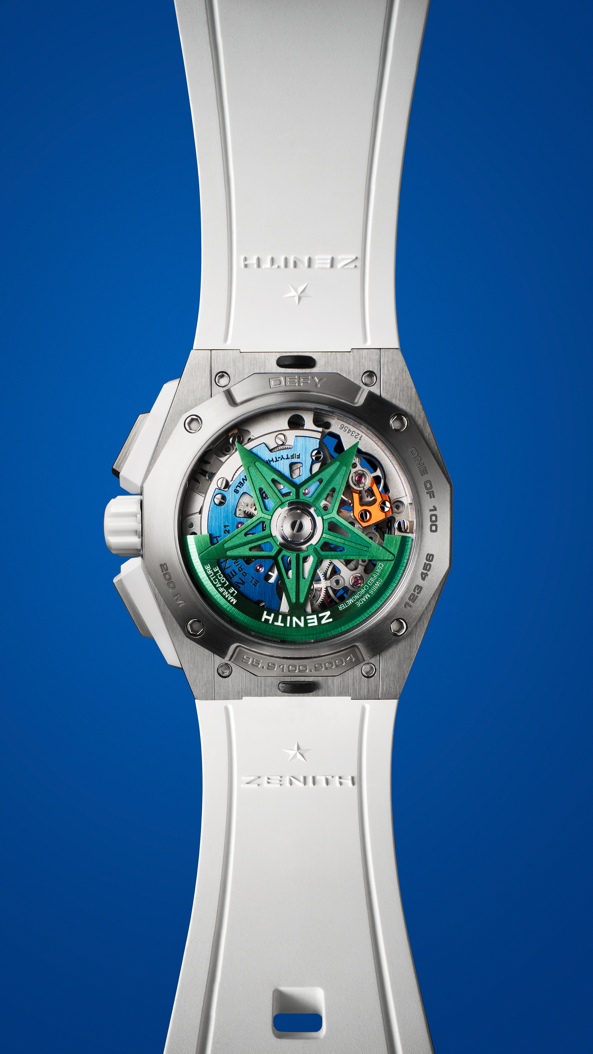 Inside the DEFY Extreme Chroma beats a unique version of the automatic El Primero 9004 calibre, whose bridges are PVD-coated in a spectrum of colours. This mechanical rainbow is partially revealed through the openworked black or white dial, where the markers and printings mirror the movement’s chromatic palette in a seamless gradient. Each movement displays its own distinctive colour composition. This vivid spectrum also extends to the tips of the subsidiary dial hands – for the chronograph hours and minutes at 9 and 3 o’clock, the chronograph power reserve at 12 o’clock, and the small seconds at 6 o’clock. On the reverse side, the polychrome theme continues with ZENITH’s signature star-shaped rotor, rendered in a striking blue hue for the black edition and electric green for the white edition.